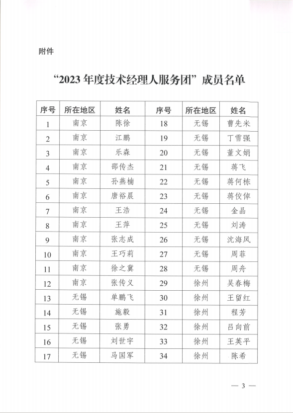 为促进全省科技成果高质量转移转化,挖掘和培养一批“知政策、精技术、会管理、懂金融、明法律、通市场、擅转化”的高素质复合型技术转移人才,通过平台赋能、资源互补、分工协作,有效链接供需两端、促成技术交易,形成服务示范。根据《关于招募江苏省技术产权交易市场“2023年度技术经理人服务团”成员的通知》的有关要求,江苏省技术产权交易市场(以下简称省技术产权交易市场)组织开展了“2023年度技术经理人服务团”(以下简称服务团)成员招募工作。经推荐申报、形式审查、综合筛选,共遴选出94名技术经理人组建成为服务团。现将名单公布如下(排名不分先后)。